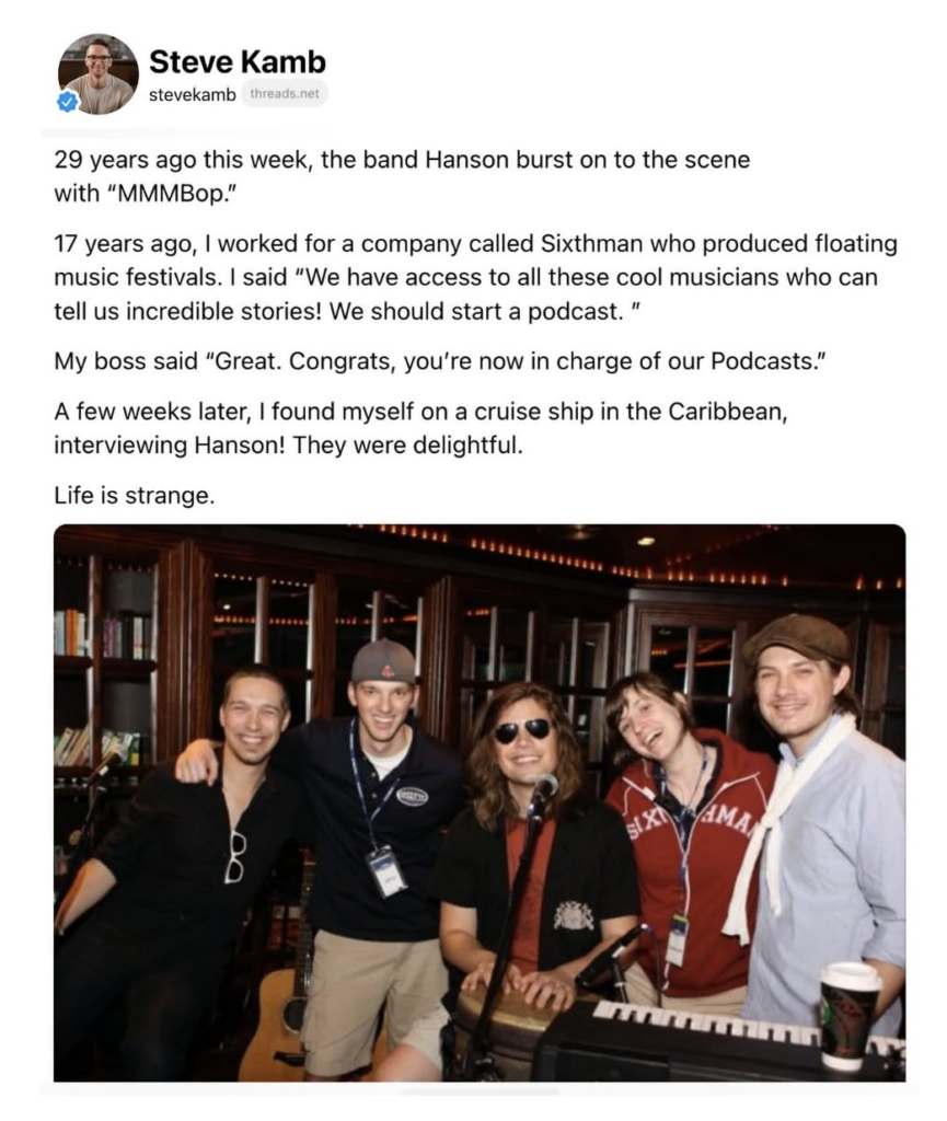 19 years ago, I said to my boss at my old company “We should have a podcast!” and two weeks later I found myself interviewing Zac Brown, Brandi Carlile, and Hanson while floating through the Caribbean.