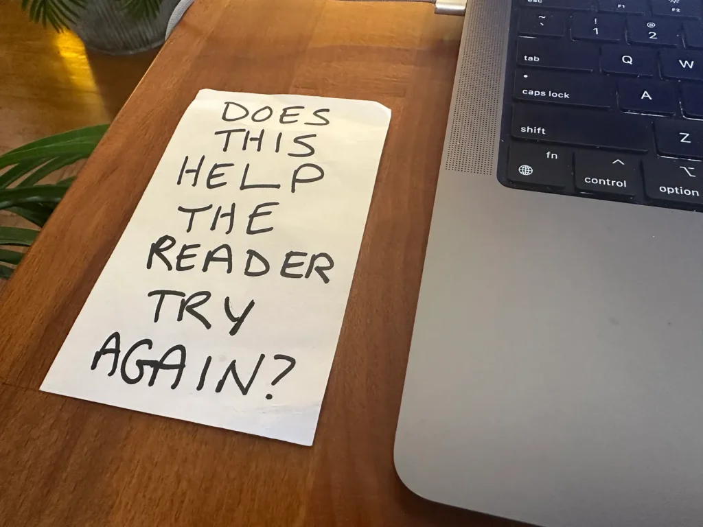 Suddenly, the paralyzing decision of what to keep and cut got easier. I chopped out tens of thousands of words. Not because they weren’t great stories, but because they didn’t “help the reader try again.” If the story/lesson helped the reader try again, it stayed. If it didn’t, it had to go.